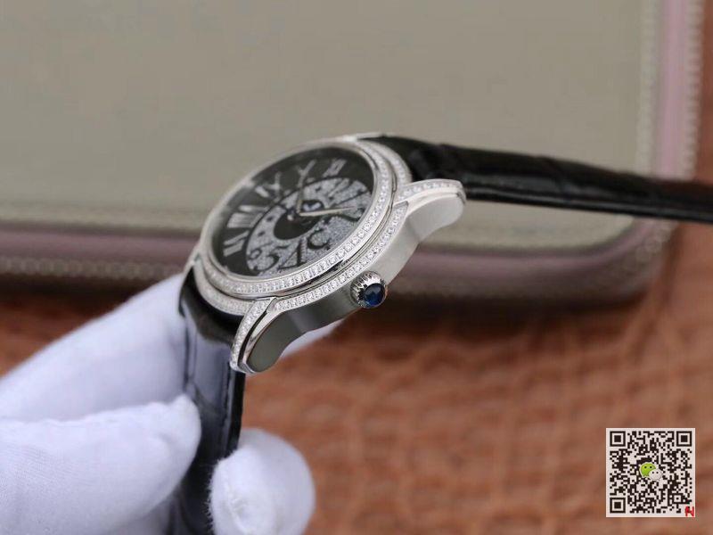 The replica Audemars Piguet Millenary Lady 77302BC.ZZ.D001CR.01 Black Dial watch is powered by the natural swing of the wrist. The 18K white gold case is set with a US diamond, an anti-glare sapphire crystal glass mirror and a crown set with a black convex sapphire. The black dial is decorated with a “flinqué” spiral pattern, and is matched with a US diamond eccentric dial, convex hour markers, black three-dimensional Arabic numerals, white three-dimensional Roman numerals and hands. 192 bright cut diamonds with a total weight of approximately 1.832 carats (case, bezel, ear and buckle). 211 US diamonds with a total weight of about 0.41 carats (dial). Audemars Piguet Millenary Lady 77302BC.ZZ.D001CR.01 Black Dial Replica Watch.