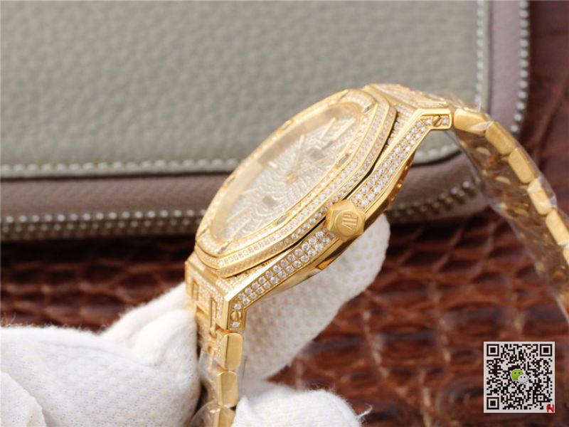 Replica Audemars Piguet Royal Oak 15400.OR01 Diamonds Dial Watch, 18K yellow gold case with full diamonds, octagonal gold bezel set with 8 screws fixed bezel, scratch-resistant anti-glare sapphire crystal glass, gold diamond dial, filled with fluorescent material, three-dimensional gold-rim The hour mark, as well as the hour and minute hands, the super luminous effect can read the time normally in the night, and the calendar is displayed in the 3 o’clock position window. Audemars Piguet Royal Oak 15400.OR01 Diamonds Dial Replica Watch. Gold crown, hexagonal head engraving AP logo. The gold brushed bottom ring has 8 screws to fix the bottom ring and transparent sapphire crystal glass. Swiss ETA3120 Ultra-thin automatic machine movement, precise and stable travel time. Gold-encrusted strap with folding clasp. The buckle engraving brand AP logo.