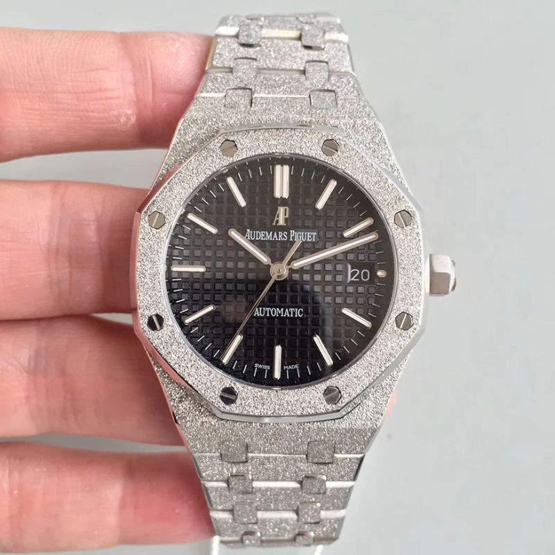 OM Factory Replica Audemars Piguet Royal Oak Frosted Gold 15454 Black Dial watch, stainless steel cream gold case, octagonal steel frosting gold bezel 8 titanium screws, scratch-resistant anti-glare sapphire crystal glass, black dial engraved “Tapisserie Evolutive” large plaid, 3 points The position black window displays the calendar, the silver-colored bar-shaped hour markers filled with white luminous materials, as well as the hour and minute hands, and the powerful luminous effect can read the time normally in the night. Audemars Piguet Royal Oak Frosted Gold 37MM 15454 OM Factory Black Dial Replica Watch. Stainless steel crown, hexagonal head matte shading engraved AP English letters. Octagonal steel brushed bottom ring, 8 titanium fixed, transparent sapphire crystal glass bottom cover visible movement structure. Swiss Audemars Piguet 3120 Automatic Movement, precise and stable travel time, excellent performance. Stainless steel cream gold strap, with frosted gold folding buckle, buckle engraving brand AP logo.
