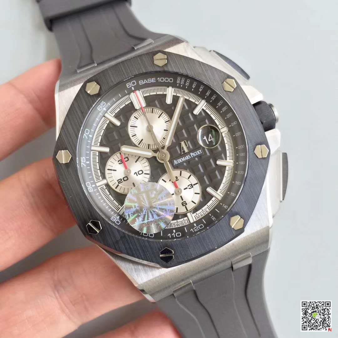JF Factory Replica Audemars Piguet Royal Oak Offshore 26400IO.OO.A004CA.01 V2 Black Dial watch, titanium alloy case and black ceramic bezel, MégaTapisserie pattern, rhodium-plated tone counter, platinum-coated time stamp and Royal Oak pointer, luminescent coating and gray inner frame. Audemars Piguet Royal Oak Offshore 26400IO.OO.A004CA.01 JF Factory V2 Black Dial Replica Watch. Black rubber strap with titanium buckle. With Swiss AUDEMARS PIGUET 3126 Automatic Movement, equipped with 59 precious stones and 365 parts, it can provide 60 hours of power storage when fully chained.