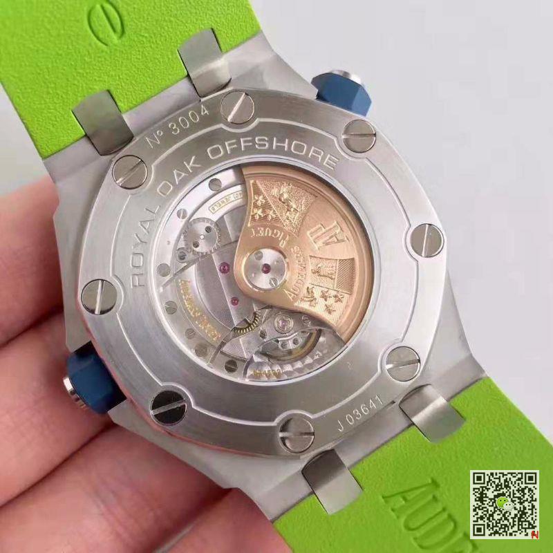 JF Factory Replica Audemars Piguet Royal Oak Offshore Diver 15710ST.OO.A038CA.01 Green Dial Watch, stainless steel brushed polished case, octagonal steel brushed bezel 8 titanium metal screws fixed, scratch-resistant anti-glare sapphire crystal glass mirror, green dial engraved “Méga Tapisserie” large plaid decoration, panel Outer ring green diving timing scale, inner circle white minute scale, filled with white luminous material, three-dimensional silver side nail hour mark, and hour and minute hands, super luminous effect night can accurately read the time, 3 o’clock position window display calendar, the 10 o’clock position is the diving exhaust button. Audemars Piguet Royal Oak Offshore Diver 15710ST.OO.A038CA.01 JF Factory Green Dial Replica Watch. Blue hexagonal crown, stainless steel engraved AP English letters. Stainless steel brushed bottom ring, transparent sapphire crystal glass bottom cover, Swiss Audemars Piguet 3120 Automatic Movement, the movement function is the same as the original, power reserve for 60 hours. Green rubber strap, soft and comfortable to wear, with stainless steel brushed pin buckle, buckle engraved AP logo.