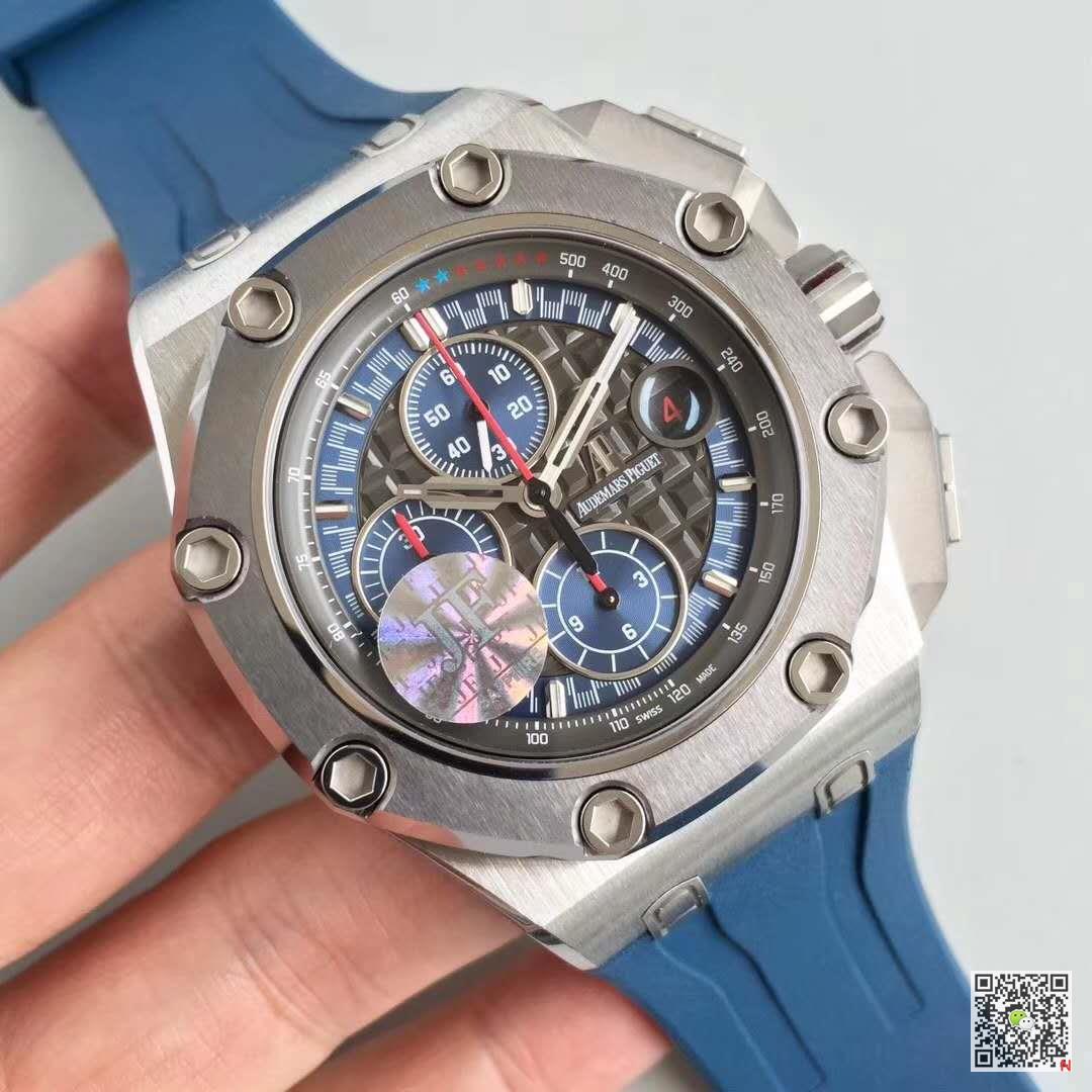 JF Factory Replica Audemars Piguet Royal Oak Offshore Michael Schumacher 26568PM.OO.A021CA.01 V8 Dark Grey Dial Watch, stainless steel brushed polished case, octagonal steel brushed bezel 8 screws fixed, scratch-resistant anti-glare sapphire crystal glass mirror, dark grey dial engraved “Méga Tapisserie” oversized plaid decoration, with blue Timer, white gold fluorescent hour markers and Royal Oak pointers, and a dark gray inner bezel with a tachometer scale. Audemars Piguet Royal Oak Offshore Michael Schumacher 26568PM.OO.A021CA.01 JF Factory V8 Dark Grey Dial Replica Watch. Stainless steel crown and chronograph button, non-slip table engraved red letters on the bottom of the “AP” English letters. The octagonal steel brushed bottom ring is fixed by 8 screws, and the transparent sapphire glass bottom cover is fully visible. Swiss Audemars Piguet 3126 Automatic Movement, the movement function is the same as the original. Blue rubber strap, soft and comfortable to wear, with stainless steel pin buckle and buckle engraving brand logo.