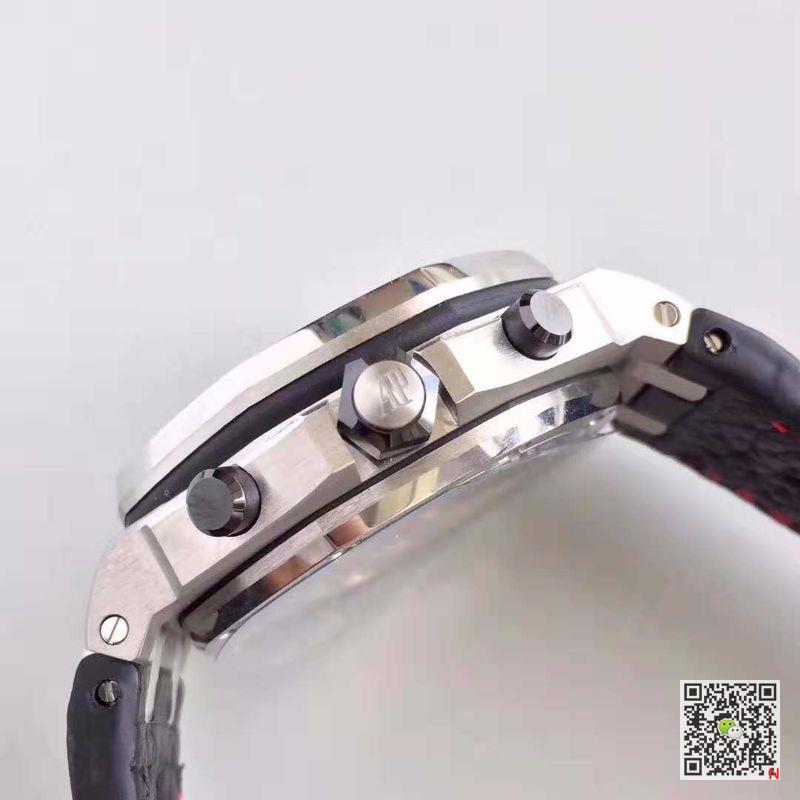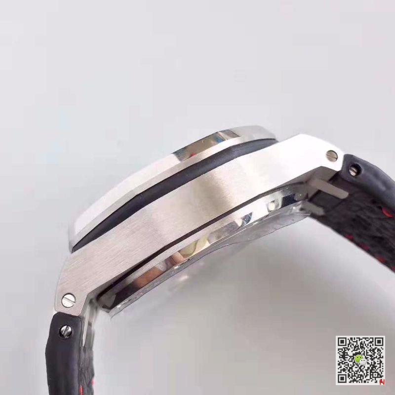 JF Factory Replica Audemars Piguet Royal Oak Offshore Navy 26470ST.OO.A027CA.01 V2 Blue Dial watch, with brushed polished and polished fine steel bezel and sapphire blue dial, if you look closely, you will find the dial is engraved with “MégaTapisserie” oversize grid decoration, with white fluorescent Arabic numerals, platinum fluorescent RoyalOak Royal Oak pointer and blue inner bezel. The watch has precise timing function, with 12-hour and 30-minute timing at 6 o’clock and 9 o’clock respectively, and the calendar display window at 3 o’clock. Audemars Piguet Royal Oak Offshore Navy 26470ST.OO.A027CA.01 JF Factory V2 Blue Dial Replica Watch. Black ceramic screw-in crown and button, waterproof up to 100 meters deep, rubber watchband and red timing pointer, contrasting color combination symbolizes youth and vitality. Functionally, the wristwatch has a precise timing function. Buttons on both sides of the crown indicate the start and stop of timing respectively, making the operation convenient and simple. In terms of power, the watch is equipped with a Calibre3126 movement inside, with a power reserve of 55 hours.