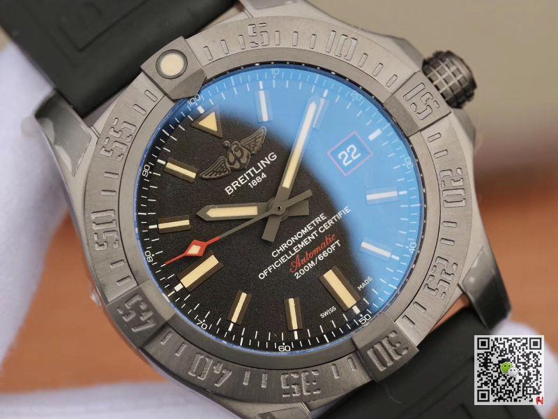 GF Factory Breitling Avenger Blackbird 44mm V173311 V4 Black Dial watches’ dial layout is full of strength and extremely professional aesthetic style. It is inlaid with three-dimensional rectangular time scales, with classic three-pointer center and date window display function at 3 o’clock position. It strives to be extremely perfect in professionalism and fully shows the excellent quality necessary for a popular watch. Case carbonitriding treatment, crystal plating treatment, oxidation resistance, no blackening! Breitling Avenger Blackbird 44mm V173311 GF Factory V4 Black Dial Replica Watch. The back is designed with a dense bottom, and the titanium alloy bottom cover is brushed, showing a matte effect, engraved with the brand logo of “BREITLING” and English parameters. The back cover of the watch case is a screw-in back cover with a flight chart engraved on it and a frosted logo in the middle, which can be waterproof for 200 meters.
