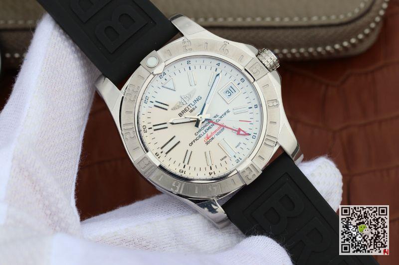 GF Factory Replica Breitling Avenger II GMT A3239011/G778/153S White Dial Watch, stainless steel polished case, bi-directional rotating ceramic bezel tick mark, anti-scratch anti-glare sapphire crystal glass mirror, white dial, dial outer ring 24 hour tick mark, super practical 24-hour second time zone display function The second time zone time can be read in combination with the bidirectional rotating bezel. The night light nails the hour mark and the sword-shaped pointer, and the night can read the time normally. Breitling Avenger II GMT A3239011/G778/153S GF Factory White Dial Replica Watch. Stainless steel crown, non-slip head with blue bottom engraving brand logo. Polygonal steel bottom case, frosted inner ring engraving brand logo. Swiss ETA2836 automatic movement, power reserve for 40 hours. Black rubber strap, soft and comfortable to wear, with steel pin buckle and buckle engraving brand logo.