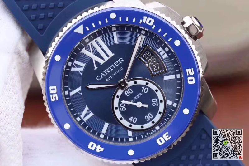 JF factory replica Calibre De Cartier Diver WSCA0010 Blue Dial watches adopt Swiss ETA A23J automatic mechanical movement that is accurate and stable. Size is 42mm x 11mm, and adopt solid 316L stainless steel case and uni-directional rotating DLC plated stainless steel bezel that grinding and polishing craftsmanship are exquisite, not fade. Calibre De Cartier Diver WSCA0010 42MM JF Factory Blue Dial Replica Watch. Use blue rubber strap that exquisite in workmanship, elegant, leisure and not fade, and match Cartier exclusive tang buckle. Adopt scratch-proof sapphire crystal with AR coating watch mirror, and dense bottom design.