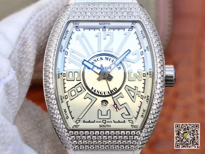 Replica Franck Muller Vanguard V45.SC.DT.D.NBR.CD.5N.NR Silver Dial Watch, stainless steel and diamond case, scratch-resistant anti-glare sapphire crystal glass, silver brushed polished dial, white outer ring black tick mark, inner ring black minute scale and black square hour mark, with three-dimensional shaped black border Arabic numerals silver hour markers, hollowed hour and minute hands, 6 o’clock circular window showing calendar. Franck Muller Vanguard V45.SC.DT.D.NBR.CD.5N.NR Silver Dial Replica Watch. Stainless steel crown, non-slip watch with blue bottom engraving brand logo. The steel brushed bottom case, the engraving brand LOGO text size and font are consistent with the original. Swiss ETA2824-2 automatic movement, the movement function is the same as the original. White rubber with black crocodile leather strap, stainless steel folding clasp. Stainless steel butterfly clasp engraving brand logo.