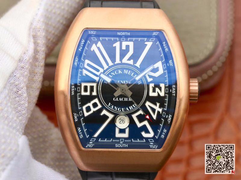 Replica Franck Muller Vanguard V45-02 18K Rose Gold Black Dial Watch, 18K rose gold polished wine barrel case, sandwich structure black interlayer, scratch-resistant anti-glare sapphire crystal glass mirror, black dial, black outer ring white tick mark, inner ring white minute scale and white square frame hour mark. With the shaped black-edged Arabic digital stereo white hour markers, gray hour hand, minute hand and second hand, the 6-point white window displays the calendar. Franck Muller Vanguard V45-02 18K Rose Gold Black Dial Replica Watch. Rose gold crown, non-slip watch engraved brand logo on black background. Rose gold brushed bottom case, the engraving text size and font are the same as the original. Swiss ETA2824 automatic movement, the movement function is the same as the original. Black crocodile leather strap with rose gold folding clasp. Rose gold butterfly clasp engraving brand logo.