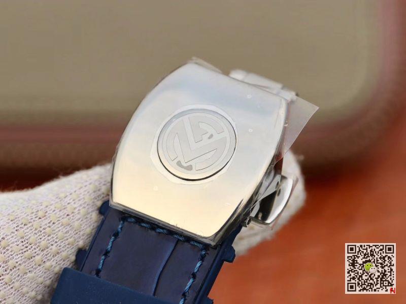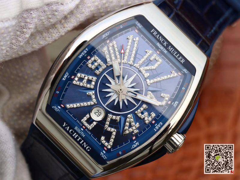 Replica Franck Muller Vanguard V45 45MM Blue Dial Watch, steel polished barrel case, sandwich structure blue interlayer, scratch-resistant anti-glare sapphire crystal glass mirror, blue textured dial, blue outer circle white tick mark, inner circle white minute scale and Square red edge white luminous time scale, with shaped silver and diamond Arabic numerals, silver hour hand, minute hand and second hand, 6 o’clock position white window respectively display calendar. Franck Muller Vanguard V45 45MM Blue Dial Replica Watch. Stainless steel crown, non-slip watch engraving brand logo. The steel brushed bottom case has the same size and font as the original. Swiss ETA2824 automatic movement, the movement function is the same as the original. Blue rubber with black crocodile leather strap with steel folding clasp. Butterfly clasp engraving brand logo.