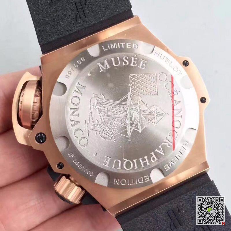 V6 Factory Replica Hublot Big Bang King Power Musee Oceanographique Monaco 731.OX.1170.RX Black Dial watch, fine steel 18k gold plated case, sapphire crystal glass watch mirror, black carbon fiber dial, super luminous glow, solid titanium metal bezel, quick detachable black rubber strap (quick installation button in the ear), titanium metal buckle. Hublot Big Bang King Power Musee Oceanographique Monaco 731.OX.1170.RX V6 Factory Black Dial Replica Watch. Swiss ETA 7750 Automatic Movement is accurate and durable. The dense bottom shell is engraved with patterns and characters, which are almost the same as the original.
