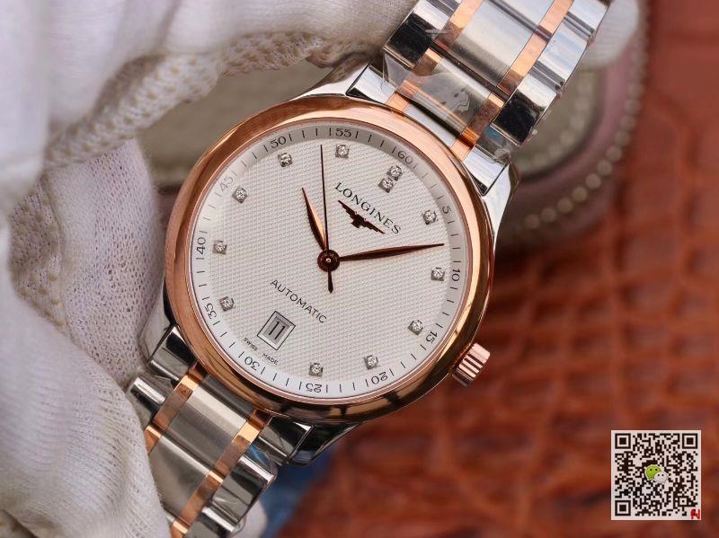 KY Factory Replica Longines Master Collections L2.628.5.97.7 White Dial watch, brushed steel case, 18K rose gold polished bezel, scratch-resistant anti-glare sapphire crystal, white grain dial, beveled white outer ring, black minute scale, with 12 square silver diamonds mark, rose gold sword-shaped hour, minute and second hands, 6 o’clock position white window displays calendar. Longines Master Collections L2.628.5.97.7 KY Factory White Dial Replica Watch. Rose gold crown with triangular pit pattern and engraving brand logo. Stainless steel polished bottom ring, transparent sapphire glass. Swiss ETA2824 automatic movement, the movement function is the same as the original. Rose-gold brushed strap with five-chain steel and folding steel folding clasp. Clasp engraving brand logo.