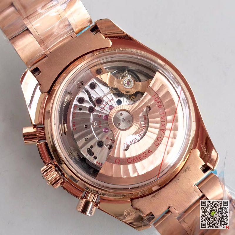 Replica Omega Speedmaster Moonwatch Moonphase Chronograph 304.63.44.52.01.001 Black Dial watch, 18K rose gold case with black ceramic bezel with speed measuring scale, black sun line frosted dial with diamond polished 18K rose gold time scale and pointer. The 6 o’clock position is equipped with accurate moon phase display. Its hand-carved 18K rose gold moon disc is filled with enamel and sprayed with sparkling silver powder representing stars. Omega Speedmaster Moonwatch Moonphase Chronograph 304.63.44.52.01.001 Black Dial Replica Watch. The swiss omega 9300 automatic movement with guide post wheel and coaxial escapement system can resist a magnetic force of 15000 gauss. The double spring boxes are connected with each other, the power is stored for 60 hours, and the movement can be seen through the transparent bottom case design. Central hour, minute and chronograph seconds hand, small seconds hand, hand date display, 12-hour chronograph and 60-minute chronograph, moon phase display. 18K Rose Gold Pendulum and Bridge Plate. 18K rose gold bracelet with folding buckle. The clasp is engraved with Omega symbol and brand LOGO.