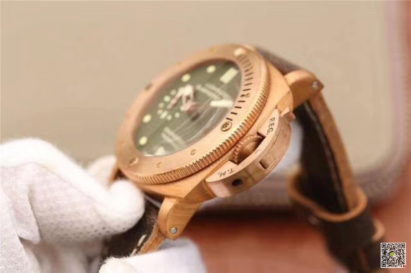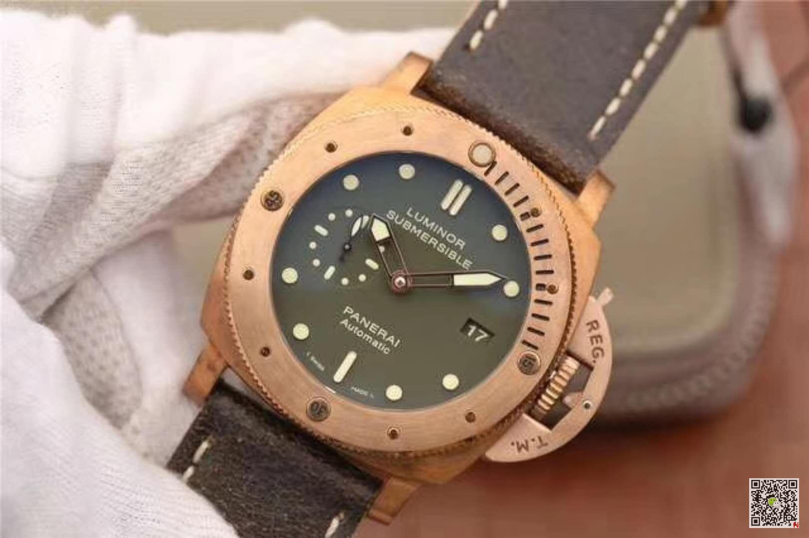 VS Factory replica Panerai Luminor Submersible 1950 Bronzo PAM382 V2 Green Dial watch, the dark green frosted surface, the hands and the scale mark are all treated in copper color, echoing the bronze case. On the polishing of the pointer, we can really see VS factory’s care and attention to this watch. The polishing is very fine, full of luster, and no burr can be seen on the edge. Panerai Luminor Submersible 1950 Bronzo PAM382 VS Factory V2 Green Dial Replica Watch. The scale of the time scale is full of stereoscopic impression, and the edge is polished very carefully without burrs. The luminous filling is also very full and even. Luminous effect is very good. The calendar window is very flat and full of fonts. The small second hand is also treated with metallic copper color, and the edge is polished cleanly without burrs. The luminous filling of the pointer is very uniform, and the luminous scale proportion of the small dish is well controlled. From the design of the dial, we can also see that the scale, time scale, pointer and calendar all have a common feature of “big”, which is also the most intuitive feeling brought to us by the whole watch. Combining with VS factory’s exquisite workmanship, it brings another classic work to all friends.