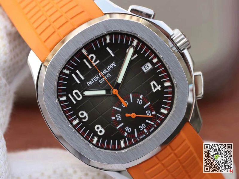 The replica Patek Philippe Aquanaut Chronograph 5968A Orange Rubber Strap Black Dial watch and stainless steel watch have unique and exquisite appearance, which perfectly combines the timing function with the exclusive design of Aquanaut series and has unique charm. The 60-minute accumulation timer at 6 o’clock adopts the classic contour of round octagonal bezel. Slender buttons are located on both sides of the crown protector, harmonious and natural. The timing display (chronograph pointer, outer edge track scale to one quarter of a second, 60-minute accumulation timer) is marked in orange, in sharp contrast to the black dial with Aquanaut series relief decorative pattern. The three-dimensional Arabic numerals made of platinum material and the widened stick pointer are coated with fluorescent coating to ensure legibility. Equipped with CH28-520C Caliber self-winding flyback chronograph movement, it perfectly integrates tradition and innovation. The watch combines the classic star wheel control device with the modern vertical clutch, which can prevent the pointer from jumping or bouncing when the timing function is started. Since the clutch causes little friction, the center chronograph second hand can also be used as a continuously rotating center second hand, thus eliminating the need for a small second hand dial. The flyback function can directly start a new timer when the timer pointer rotates without resetting. With the aid of the stop function, the chronograph second hand is instantly converted into a continuous second hand, which is convenient to synchronize the watch with the time signal. Patek Philippe Aquanaut Chronograph 5968A Orange Rubber Strap Black Dial Replica Watch. With the screw-in crown, the waterproof coefficient of the watch case can reach 120 meters. The front and sides of the case are treated with fine frosting, just like the smooth and shiny chamfered polished bezel, which shines with vivid luster. The conspicuous orange color, applied to the hands, scales and watchbands, also makes the “grenade” originally belonging to sports watches more youthful and energetic. The 42mm fine steel case is equipped with flyback timing function. The iconic round octagonal case, dark brown relief dial and the 60-minute chronograph at the 6 o’clock position adopt the same round octagonal classic contour as the bezel.