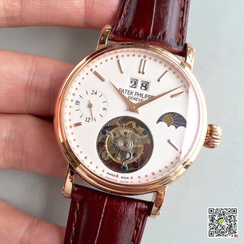 Replica Patek Philippe Tourbillon Moonphase 24H Power Reserve White Dial Watch, 316L stainless steel plated 18K rose gold brushed polished case, scratch-resistant anti-glare sapphire crystal glass mirror, silver-white dial, outer ring gold three-dimensional small dot minute marks and large dot hour marks, multi-faceted diamond rose gold Stereo arrow time scales, gold-plated sword-shaped pointers, 3 o’clock is the moon phase display, 6 o’clock is the true tourbillon, 9 o’clock is the movement 24-hour power display dial, 12 o’clock double window display calendar. Patek Philippe Tourbillon Moonphase 24H Power Reserve White Dial Replica Watch. Rose gold crown, triangle pit pattern crown, blue bottom engraving brand logo. The rose gold polished bottom ring is fixed by 6 screws, and the transparent sapphire glass bottom cover can fully see the movement structure. Swiss Real Tourbillon Manual Winding Clone Patek Philippe Tourbillon movement, the movement function is the same as the original, accurate and stable travel time. Brown crocodile leather strap, soft and comfortable, with rose gold folding buckle, buckle engraved brand logo.