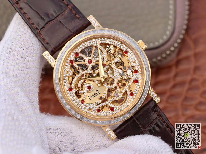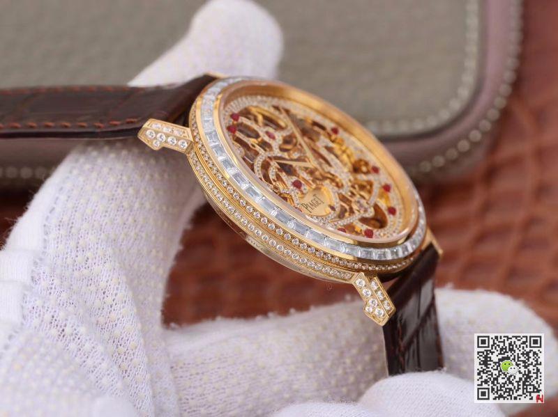 Replica Piaget Altiplano G0A39125 Rosegold Skeleton Dial watch, 18K rose gold case, set with 78 round diamonds, buckle set with 23 round diamonds, sapphire crystal transparent bottom cover. It is equipped with 1200s ultra-thin diamond-encrusted hollow automatic winding mechanical movement and rose gold main splint (3mm). The movement is set with 259 round diamonds and 11 convex round cut rubies, and the platinum pendants are treated with rose gold. Piaget ALTIPLANO G0A39125 Rosegold Skeleton Dial Replica Watch.