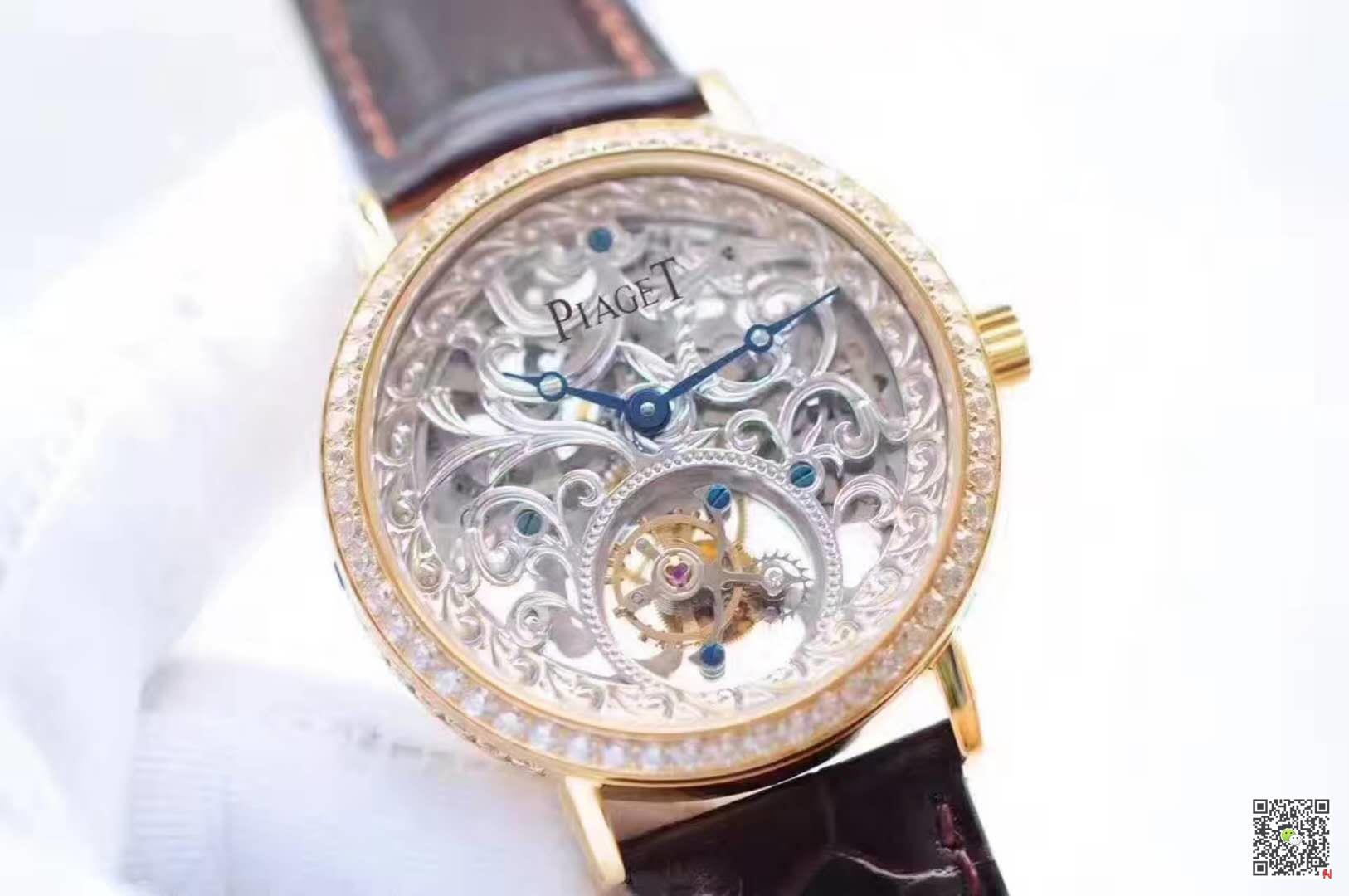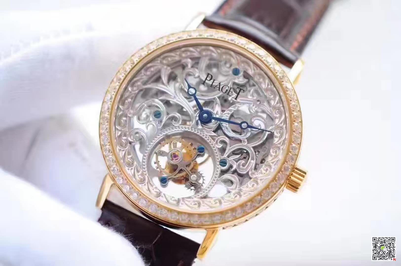 V6 Factory Replica Piaget Tourbillon Carved Skeleton Dial Watch, 18K rose gold case with side diamonds, rose gold and diamond bezel, scratch-resistant anti-glare sapphire crystal glass mirror, hand-carved pattern hollow dial, electroplated white gold pattern comparable to the original. Eccentric blue steel hands, 6 o’clock position is the true tourbillon. Piaget Tourbillon V6 Factory Carved Skeleton Dial Replica Watch. Rose gold crown, triangular pit pattern to engrave the brand logo. Screw-in rose gold bottom ring with transparent sapphire glass case back. Swiss Real Tourbillon Manual Winding, the movement function is the same as the original, power reserve for 40 hours. Brown crocodile-leather strap, soft and comfortable, with a rose gold pin buckle.