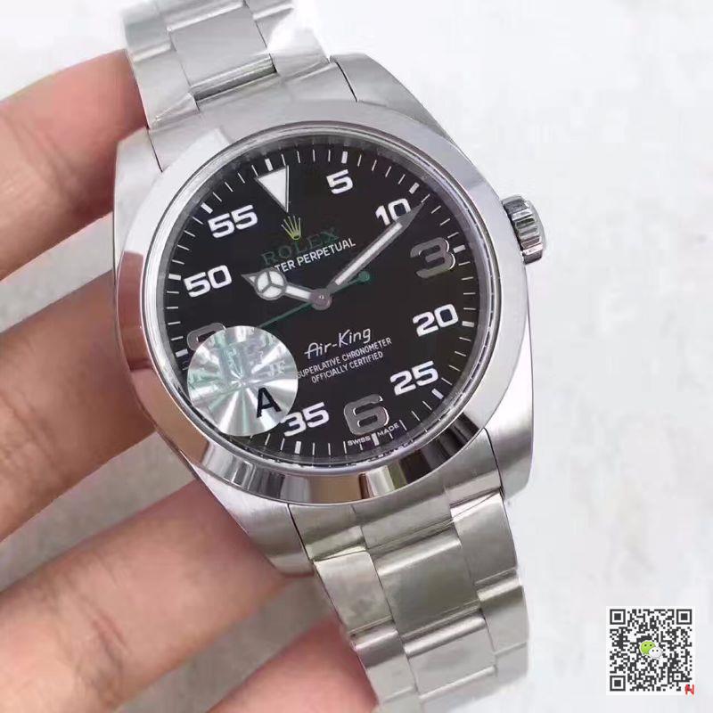 JF Factory replica Rolex Air-King 116900 Black Dial watch, 904L fine steel case, black dial, 3 o’clock, 6 o’clock and 9 o’clock positions are marked with extra large Arabic numerals made of metal, minute scale is conspicuous, and the green pointer is very similar to the original. The color of the letters on the dial and the sense of stereoscopic vision are almost the same as those of the original. The high-transmittance coated sapphire mirror can hardly see the presence of glass when viewed from the front. Rolex Air-King 116900 JF Factory Black Dial Replica Watch. The small crown of the head is restored very well, and the mouth of the tooth is three-dimensional and clear. The inner ring of the dense bottom cover has been brushed very well. The fine steel watchband, folding clasp and clasp are engraved with crown pattern. Swiss Rolex 3131 automatic movement, equipped with anti-magnetic protection device, power storage for 48 hours.