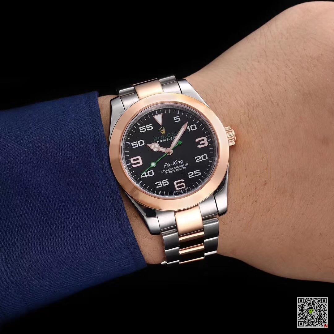 JF Factory Replica Rolex Air-King 116900 Rose Gold Black Dial watch, 904L fine steel case, rose gold watch ring, black dial, 3 o’clock, 6 o’clock and 9 o’clock positions are marked with extra-large Arabic numerals made of metal material, minute scale is conspicuous, and green pointer is very similar to the original. The color of the letters on the dial and the sense of stereoscopic vision are almost the same as those of the original. Rolex Air-King 116900 Rose Gold JF Factory Black Dial Replica Watch. The high-transmittance coated sapphire mirror can hardly see the presence of glass when viewed from the front. The golden crown restored the small crown of the head very well and the mouth of the tooth was three-dimensional and clear. The inner ring of the dense bottom cover has been brushed very well. The fine steel watchband, folding clasp and clasp are engraved with crown pattern. Swiss Rolex 3131 automatic movement, equipped with anti-magnetic protection device, power storage for 48 hours.