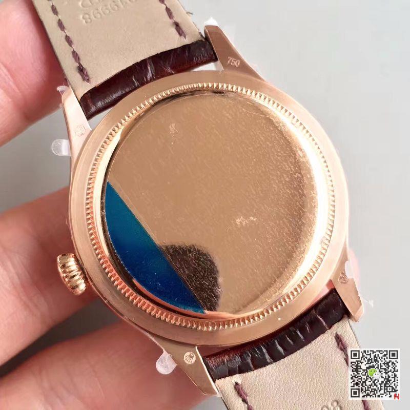 MKS factory replica Rolex Cellini 50505 V4 White Dial watches adopt stick time scales, and scales and pointers are plated 18K rose gold. The size is 39mm x 11.8mm. Equip with Swiss Rolex 3132 automatic mechanical movement that 48 hour power reserve and with Geneva imprint. Rolex Cellini 50505 MKS Factory V4 White Dial Replica Watch. Adopt 18K rose gold plated 316L stainless steel case, triangle pit pattern double bezel, dense case bottom. Use sapphire crystal glass that is anti-scratch and coated colourless anti-glare film. And adopt calfskin leather strap pressed crocodile pattern with pin buckle. And it is daily life waterproof and of nightlight effect.