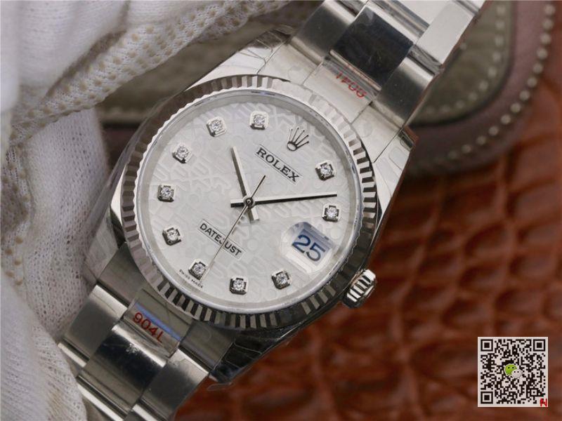 AR Factory Replica Rolex Datejust 36MM 116234 Diamond-printed Dial Watch, steel polished case, triangular pit bezel, scratch-resistant anti-glare sapphire crystal glass, diamond-printed dial, 11 diamond hour markers on the dial, 12 o’clock position is Rolex crown mark, 3 o’clock position is the window displays the calendar, and the sleek 2.5x enlarges the calendar. The steel crown and the triangular pit are engraved with the brand logo. Rolex Datejust 36MM 116234 AR Factory Diamond-printed Dial Replica Watch. Screw-in triangular pitted steel bottom case, drawing process bottom cover. Swiss ETA2836-2 25J automatic movement, the movement function is consistent with the original. Stainless steel brushed strap with stainless steel folding clasp, buckled engraving brand logo, safety clasp with 5 mm easy-to-adjust chain extension system.