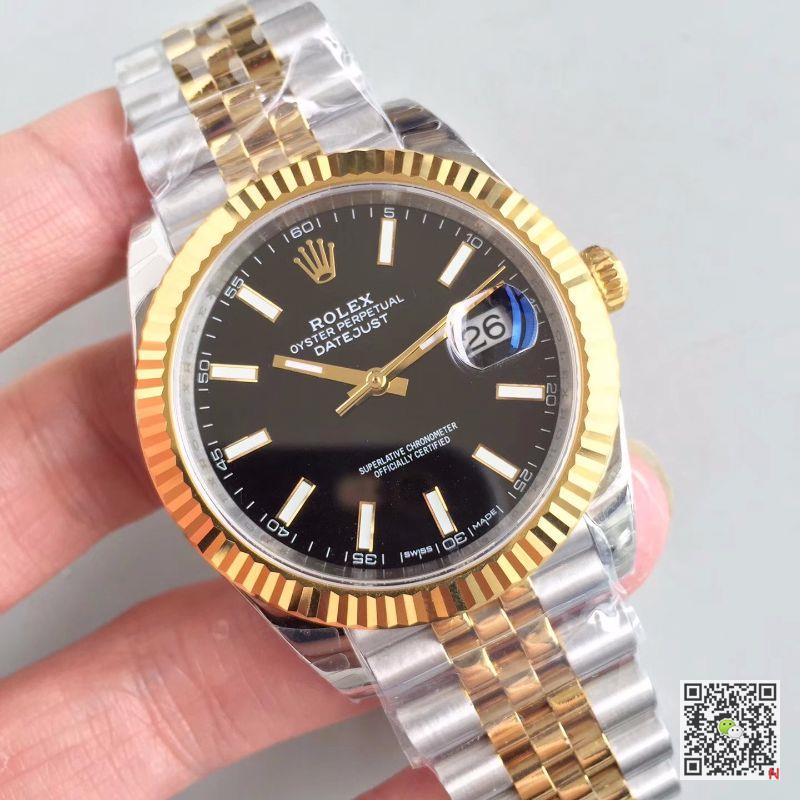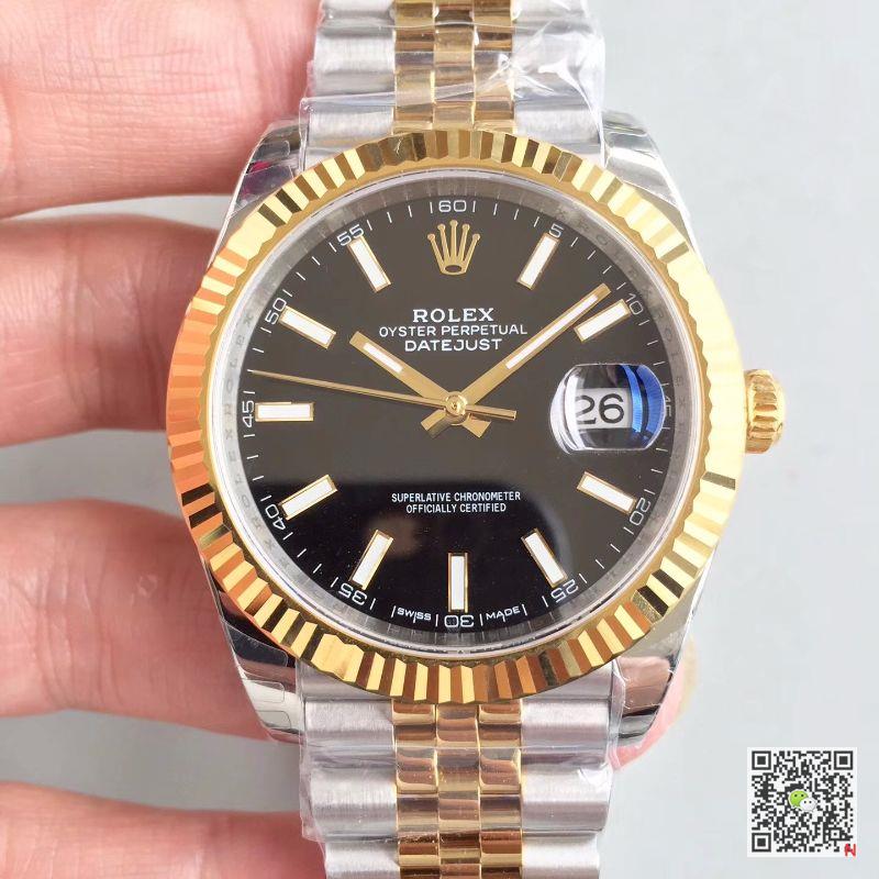 EW Factory Replica Rolex Datejust II 116333 Black Dial watch, gold steel case (904L stainless steel and 18ct gold combination), triangular pit pattern outer ring, sapphire crystal glass watch mirror, black dial, time bar row mark, 3-point anti-reflection convex magnification (2.5 times) calendar window to display date, quick correction of snap calendar, central hour, minute and second hand, pause function of second hand to accurately adjust time. Rolex Datejust II 116333 Black Dial 41MM EW Factory Replica Watch. Screw-in crown, double-button lock waterproof system, waterproof up to 100 meters deep. Swiss Rolex 3235 automatic movement, balance wheel paramagnetic blue Parachrom hairspring, high performance Paraflex cushioning device. Three rows of chain link oyster strap, oyster discount with 5mm adjustable chain link extension system, with Rolex crown pattern engraved on the clasp.