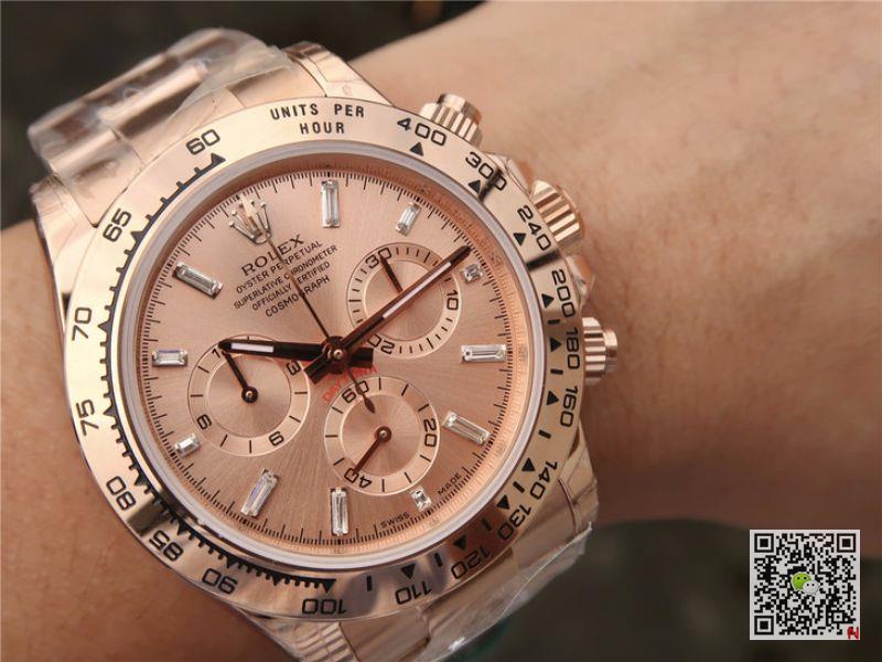 JH Factory Replica Rolex Daytona Cosmograph 116508 Rose Gold Dial Watch, 18K rose gold brushed polished case, rotating rose gold bezel engraved black speed scale, scratch-resistant anti-glare sapphire crystal glass mirror, rose gold radiant dial, black minute scale, filled with luminous material of Phnom Penh stereo The standard, as well as the gold-plated hour and minute hands, the 3 o’clock position is the 30-minute timer, the 6-point position is the 60-second timer, and the 9 o’clock position is the 12-hour timer. Rolex Daytona Cosmograph 116508 JH factory Rose Gold Dial Replica Watch. Screw-in rose gold crown and chronograph button, triangular pit pattern to engrave the Rolex crown logo. Screw-in triangular pitted rose gold polished bottom case, the bottom cover drawing process is very delicate. Swiss ETA4130 Automatic Movement, the movement function is the same as the original, power reserve 72 hours. Three-strand rose gold strap with rose gold folding clasp. The buckle engraves the Rolex crown logo.