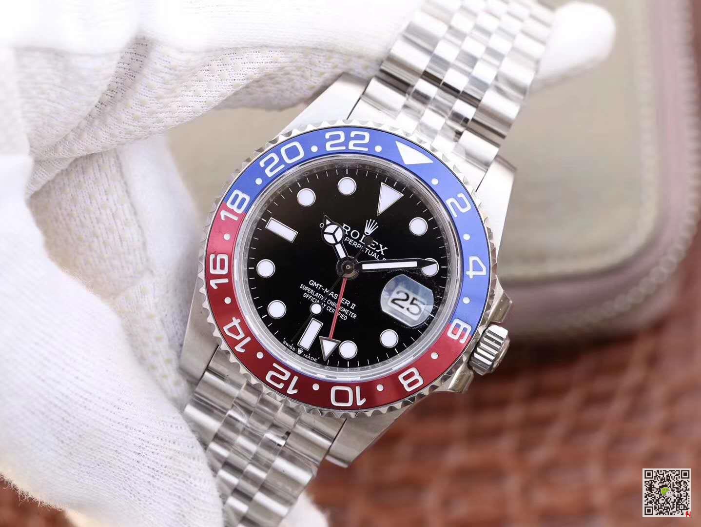 GM Factory replica Rolex GMT-Master II 126710BLRO Black Dial watch has a bright red and blue color on the outer ring, a five-bead chain belt and a three-section folding buckle. The brand-new matching design gives people a feeling of shine at the moment, and the red and blue color is unforgettable when you see it. Table fans affectionately call it a cola ring. Red represents day, blue represents night, and bright colors are more recognizable. The watch mirror is made of real sapphire crystal glass, bubble calendar display, three large needles with polished material distributed on the black disk surface+calendar display+red GMT pointer, the outer ring is made of two-color ceramic material with red and blue color, and the scale is plated with platinum, so the color is bright and bright. The color of the bezel before firing is actually green. At the beginning of the ceramic substrate, the crisp green ring turned red through the fire. Then the red bezel is chemically treated, and eventually half will turn into a blue surface. After repeated tests and mistakes, GM Factory finally sintered into a red and blue two-color watch ring with bold and brilliant colors, clear and perfect division, which is impressive. Rolex GMT-Master II 126710BLRO GM Factory Black Dial Replica Watch. The watch case is forged from 904L fine steel material and is formed in one step by top-level numerical control. The seal-cut logo on the head is clearly visible. The teeth on the bottom cover are neat and the depth is moderate. The shell and bottom cover are treated by exquisite wire drawing process, and the corners are polished and smooth. The watchband adopts a five-bead chain structure and the clasp adopts a three-section structure. All materials are forged from 904L fine steel identical to the original. The watchband is polished smooth and full of texture. The logo and other information engraved on the buckle are clearly visible, and the exquisite functional structure reflects the fine and high-precision manufacturing technology of GM factory.