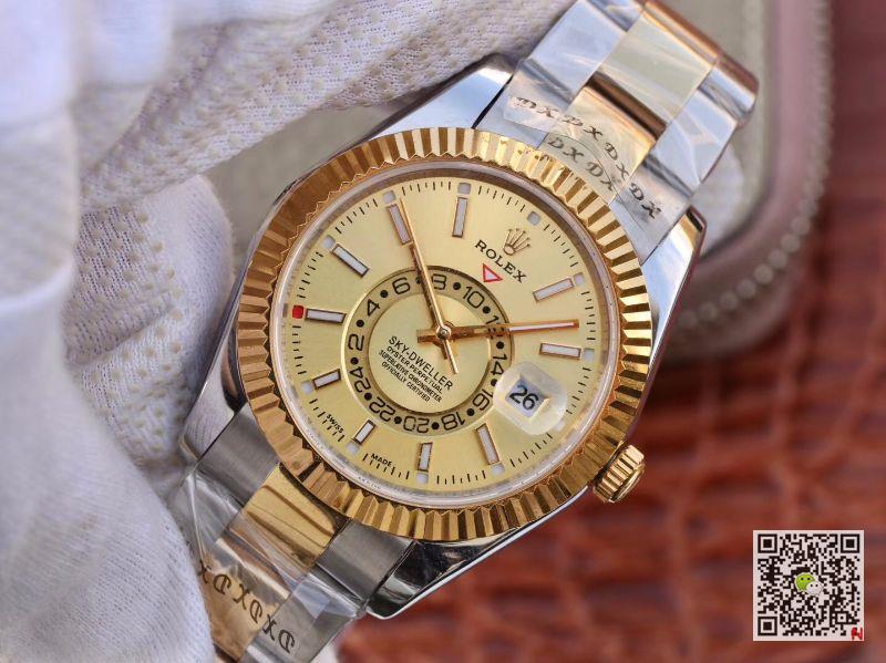 Replica Rolex SKY-DWELLER 326938-72418 Gold Dial watch, polished steel polished case, triangular 18K yellow gold polished bezel, scratch-resistant anti-glare sapphire crystal glass mirror, gold radiant dial, black line minute scale and white square hour markers, the gold-rimmed studs are stereoscopic, and the hour, minute and second hands are filled with white luminescent material. Eccentric round 24-hour scale, 3 o’clock position white window 2.5 times convex display magnified display calendar. Rolex SKY-DWELLER 326938-72418 Gold Dial Replica Watch. The screw-in gold crown, the triangular pit pattern watch crown engraved the Rolex crown logo. Screw-in stainless steel polished bottom case, the bottom ring drawing process is meticulous. Swiss ETA2836 automatic movement, the movement function is the same as the original. Gold-brushed strap with three-strand steel with stainless steel folding clasp. The gold clasp engraves the Rolex crown logo.