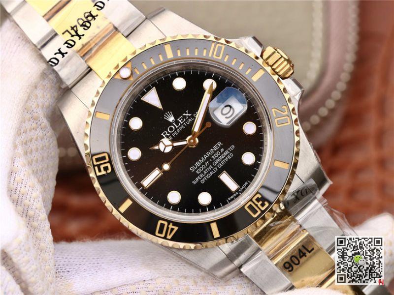 VR Factory replica Rolex Submariner Date 116613LN Black Dial watch has a black dial matched with gold. The oyster case and bracelet are made of gold steel (904L stainless steel and 18ct gold). The mixing effect of these two metals is very good, giving the watch a charming warm feeling. Sealed like a submarine’s hatch, the three-proof structure makes the waterproof function as deep as 300 meters, and it can operate as usual whether you go to the seaside to play with water or dive deep. Chromalight luminous display is available on both time scales and hands. The luminous intensity can continuously shine in water for more than 8 hours. The luminous intensity of 116613LN changes from green to blue, and the luminous duration is longer. In addition to super waterproof performance and luminous display, there is also an important design which is a watch ring rotating in one direction in reverse time and equipped with a safety lock device, in order to avoid accidental touching and miscalculation of time in water. Rolex Submariner Date 116613LN VR Factory Black Dial Replica Watch. The black Cerachrom bezel has excellent anti-corrosion effect. the color of the bezel is formed when ceramics are fired. it will never be scraped off. even if it is irradiated by strong ultraviolet rays or comes into contact with seawater, it will not fade easily. The geometric time scale, galloping needle and enlarged date window at 3 o’clock position seen on the panel. The design of special pits on the watch ring makes the watch easier to operate and quite practical. The watchband is equipped with an adjustable link extension system that can be extended by 5 mm. Through the extension system, the watchband can be extended by 2mm, and the maximum length can be increased to 20 mm. Fine workmanship makes it more comfortable to wear.