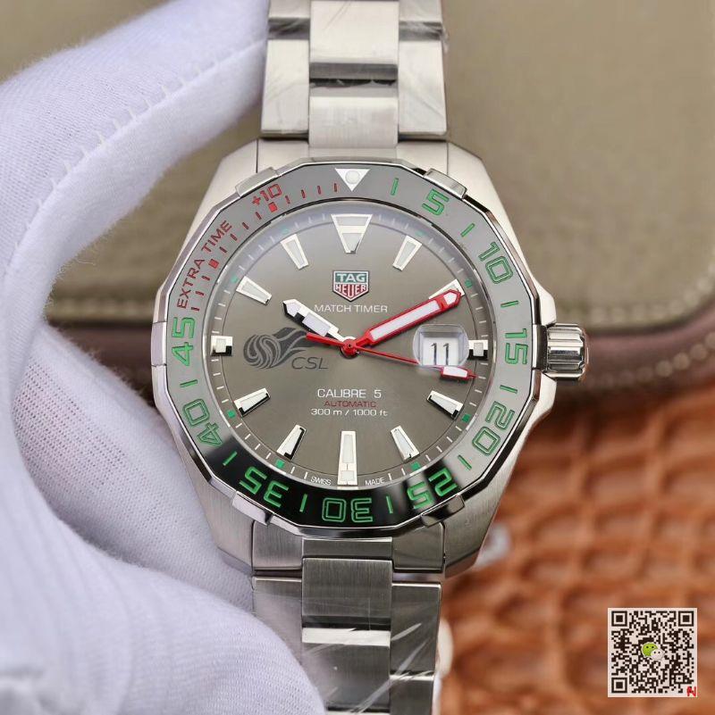 Replica Tag Heuer Aquaracer Calibre 5 Chinese Super League WAY201E.BA0927 Gray Dial watch, stainless steel brushed polished case, gray ceramic rotating bezel with green tick mark, scratch-resistant anti-glare sapphire crystal glass mirror, gray radiant dial, gray outer ring, white line minute scale and green square hour mark. The trapezoidal silver edge time stamp is filled with white luminous material, as well as the silver hour hand, red minute hand and second hand, the superb luminous effect can accurately read the time in the night. The white window at 3 o’clock position shows the calendar, and the black dive cartoon is engraved at 9 o’clock position. Tag Heuer Aquaracer Calibre 5 Chinese Super League WAY201E.BA0927 Gray Dial Replica Watch. Stainless steel ear protectors and crowns, non-slip watch engraving brand logo. Screw-in stainless steel brushed bottom case, bottom circle engraving dive cartoon. Swiss ETA2824-2 25J Automatic movement, the movement function is the same as the original. Three-strand steel brushed strap with steel folding clasp. Buckle engraving brand logo.