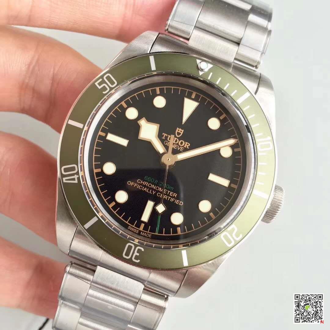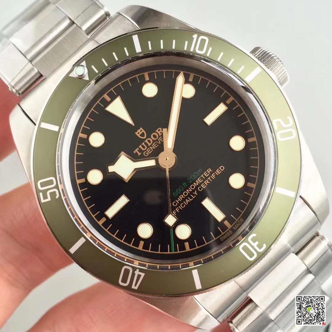 ZF Factory Replica Tudor Heritage Black Bay Green Harrods Special Edition 79230G Black Dial watch, the lid of the sapphire crystal glass mirror polished very well, the mirror looks very transparent, the two sides of the strap with willow nail inlay decoration, restore Tudor brand earlier design. The combination of the two highlights the firm and retro temperament of the watch. Tudor Heritage Black Bay Green Harrods Special Edition 79230G ZF Factory Black Dial Replica Watch. Olive green bezel is made of anodized aluminum in accordance with the original package. The physical properties (corrosion resistance, high hardness) of this material are very stable. The color similarity of the ring mouth can reach 99%, and the effect is as good as that of the genuine product.