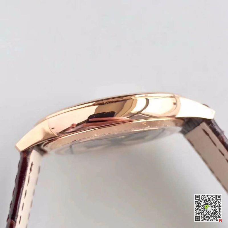 MKS Factory Replica Vacheron Constantin Patrimony 85180/000R-9166 Black Dial Watch, Dark Grey Round Dial, Black Alligator Leather Strap, 18k Rose Gold Needle Buckle, 18k Rose Gold Case, Sapphire Crystal Glass Mirror, 18k Rose Gold Crown. The round case is made of 18K 5N pink gold. Vacheron Constantin Patrimony 85180/000R-9166 MKS Factory Black Dial Replica Watch. The golden hour markers and hands are matched with the night black dial to show the calm and sagacity of the wearer. The 6 o’clock position shows the date and the vacheron brand logo is below 12 o’clock. Swiss Vacheron Constantin 2450 Q6 Automatic Movement is clearly visible through the transparent sapphire crystal bottom cover.