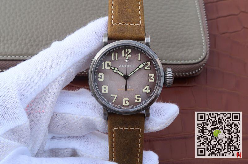 XF Factory replica Zenith Pilot 11.1940.679/91.C807 Anthracite Dial watch, imported 9015 fully automatic mechanical movement oscillates 28,800 times per hour, arc-shaped double-sided anti-glare sapphire crystal glass, grain pattern, Arabic numerals covered with beige SuperLuminova SLN luminous material, and green hour markers at night; Black ruthenium plated, faceted, covered with SuperLuminova SLN beige luminous material, night green pointer, oily sanded leather strap, rubber protective lining. Zenith Pilot 11.1940.679/91.C807 XF Factory Anthracite Dial Replica Watch.